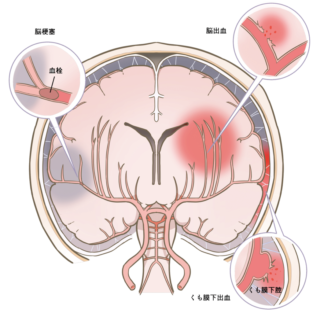 その結果、血管が詰まる「脳梗塞」や、破れる「脳出血」を引き起こします。